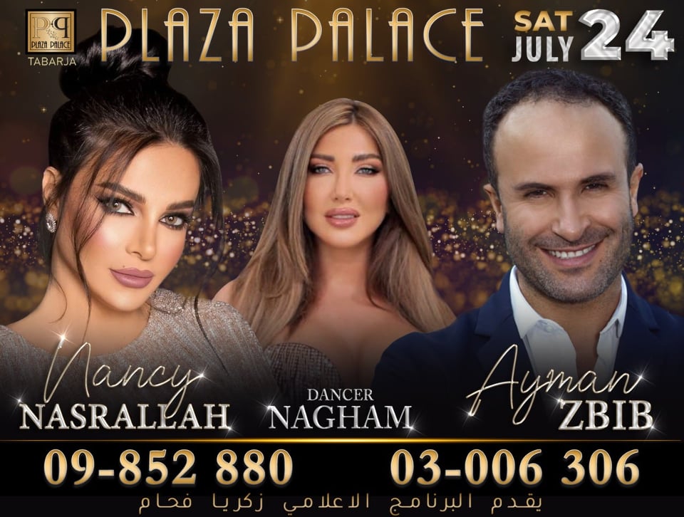 مطعم ” بلازا بالاس ” يقدّم أجمل سهرة فنيّة راقية ليل 24/7/2021 ،يحييها النجم أيمن زبيب ،النجمة نانسي نصرالله والراقصة نغم في أجواء رائعة لا تخلو من المفاجآت السارة.