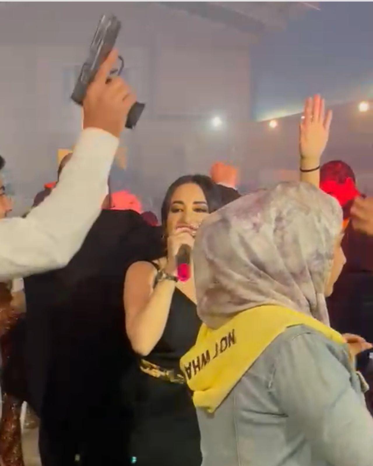وأثناء تأديتها أغنية حماسية ، رفع عدد من الساهرين مسدساتهم عاليًا وهم يختالون رقصًا وإنسجامًا مع أغنيتها.