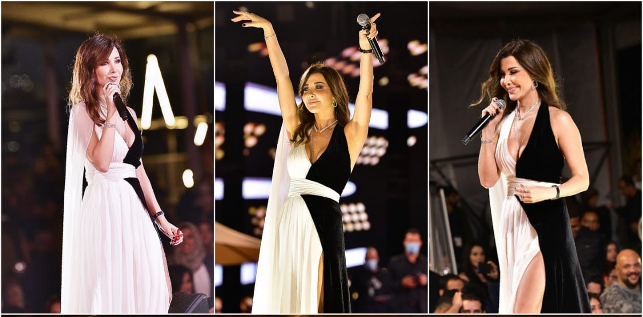 وخطفت نانسي الأنظار وهتافات الإعجاب بمجرد صعودها على خشبة المسرح بجوار فرقتها الموسيقية ومرتدية فستان نصفه أسود والآخر أبيض ومرددة لأغنية ” ما تيجي هنا وانا احبك” .