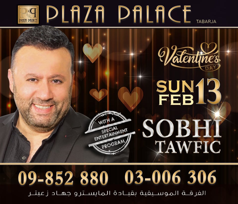 في كثير من الرومانسية والأغاني الرائعة، يحيي النجم ” صبحي توفيق ” عيد العشّاق في مطعم ” بلازا بالاس “- طبرجا لصاحبه الأستاذ روبير مخلوف في 13 فيراير حيث يقّدم باقات منّوعة من أغنياته الجميلة على أنغام الفرقة الموسيقية في أجواء حالمة حيث يشعر معها الساهرون بجمال المناسبة وروعة العيد.