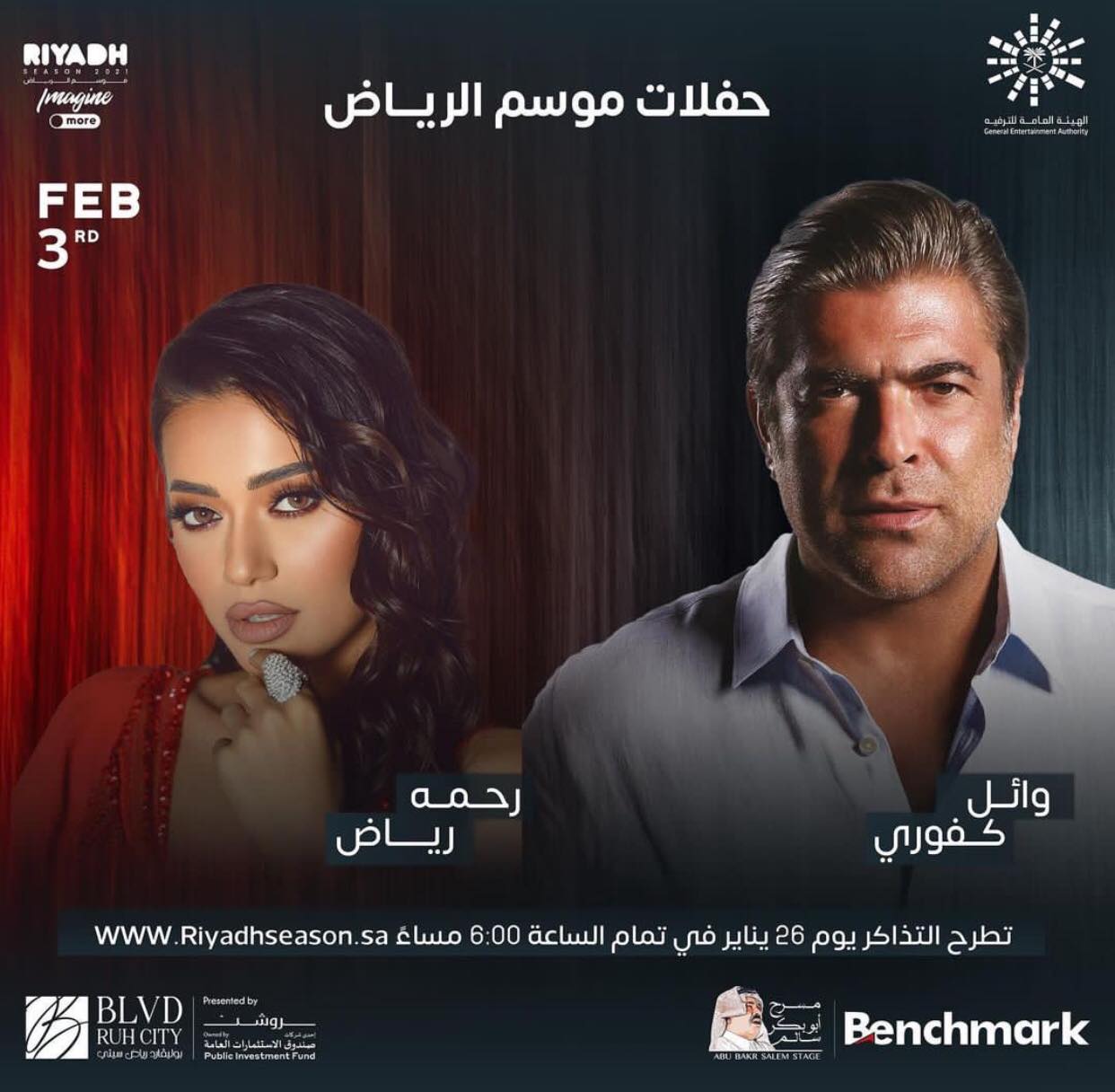 يحيى النجم اللبناني وائل كفوري حفلًا غنائيًا يوم 3 فبراير المُقبل، ضمن حفلات موسم الرياض، وتشاركه العراقية رحمة رياض، ضمن سلسلة حفلات يحيها كفوري في عدد من الدول العربية خلال الفترة المقبلة.