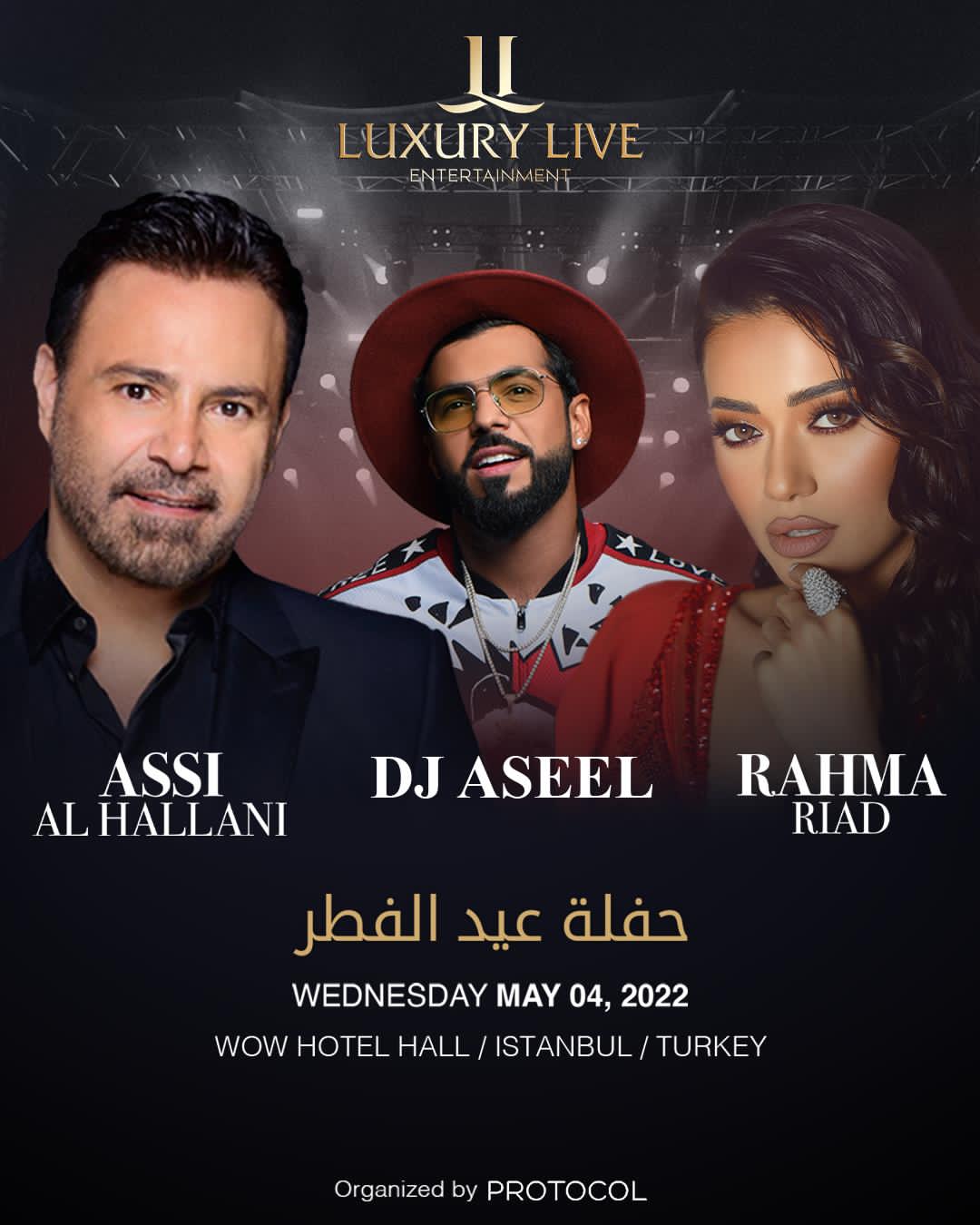 يجتمع فارس الغناء العربي عاصي الحلاّني بالنجمة العراقية رحمة رياض والـ “دي جي” أصيل في حفل مميّز في عيد الفطر السعيد من تنظيم شركة “لوكجري إنترتينمات” لصاحبها السيّد سام زهر في مدينة إسطنبول التركيّة.