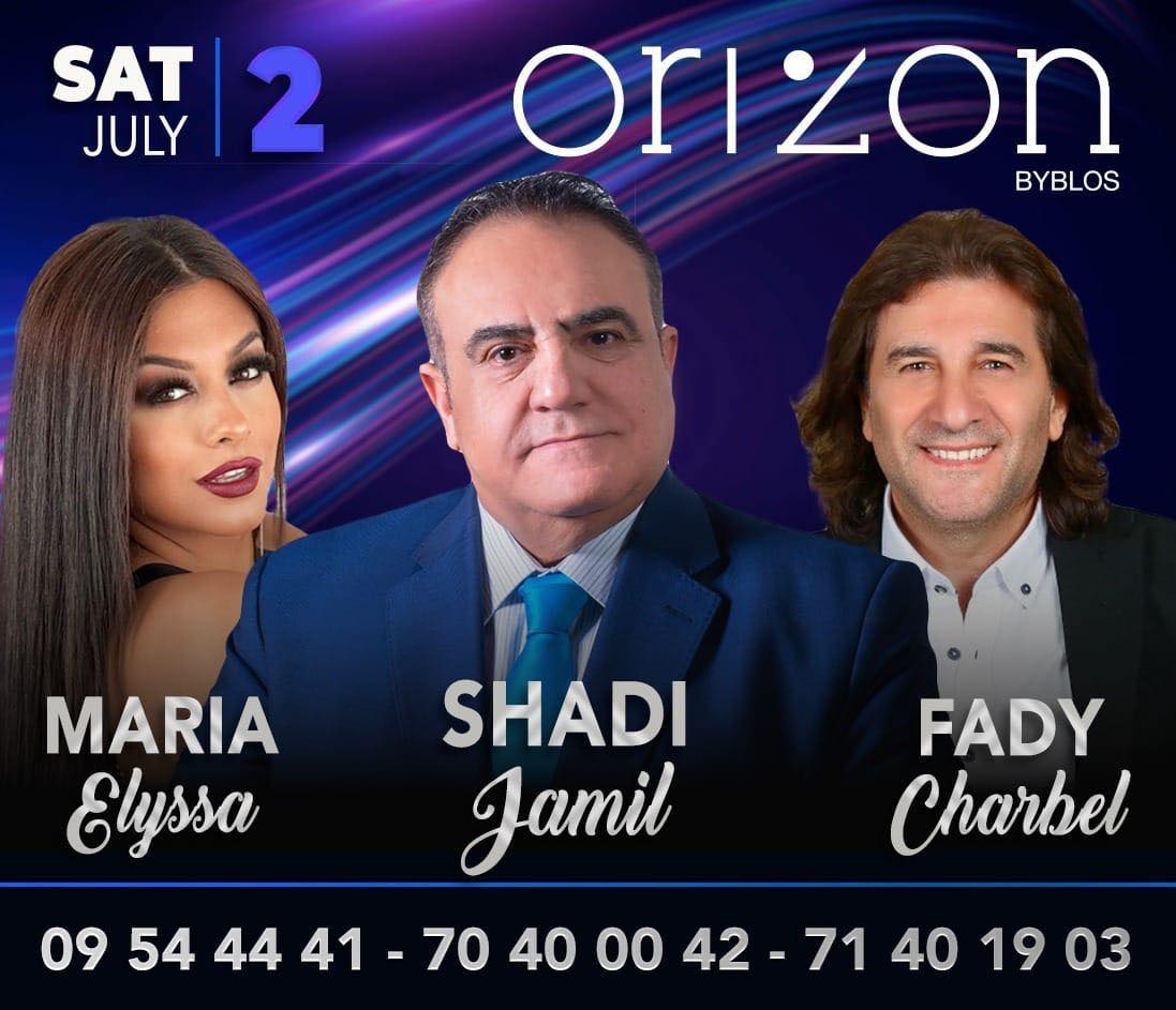 يحيي المطرب العربي الكبير شادي جميل حفلاً غنائيًا يوم 2 يوليو في الأوريزون – جبيل ، ومن المقرر أن يقدم شادي باقة من أجمل أغانيه القديمة والحديثة التي يتفاعل معها الجمهور. ويشاركه الحفل الممثل والنجم الكوميدي قادي شربل والفنانة ماريا اليسا ، ومن المتوقع أن يشهد الحفل إقبالًا كبيرًا نظرًا لكثافة الحجوزات ومحبّة الجمهور لنجمهم المفضّل.