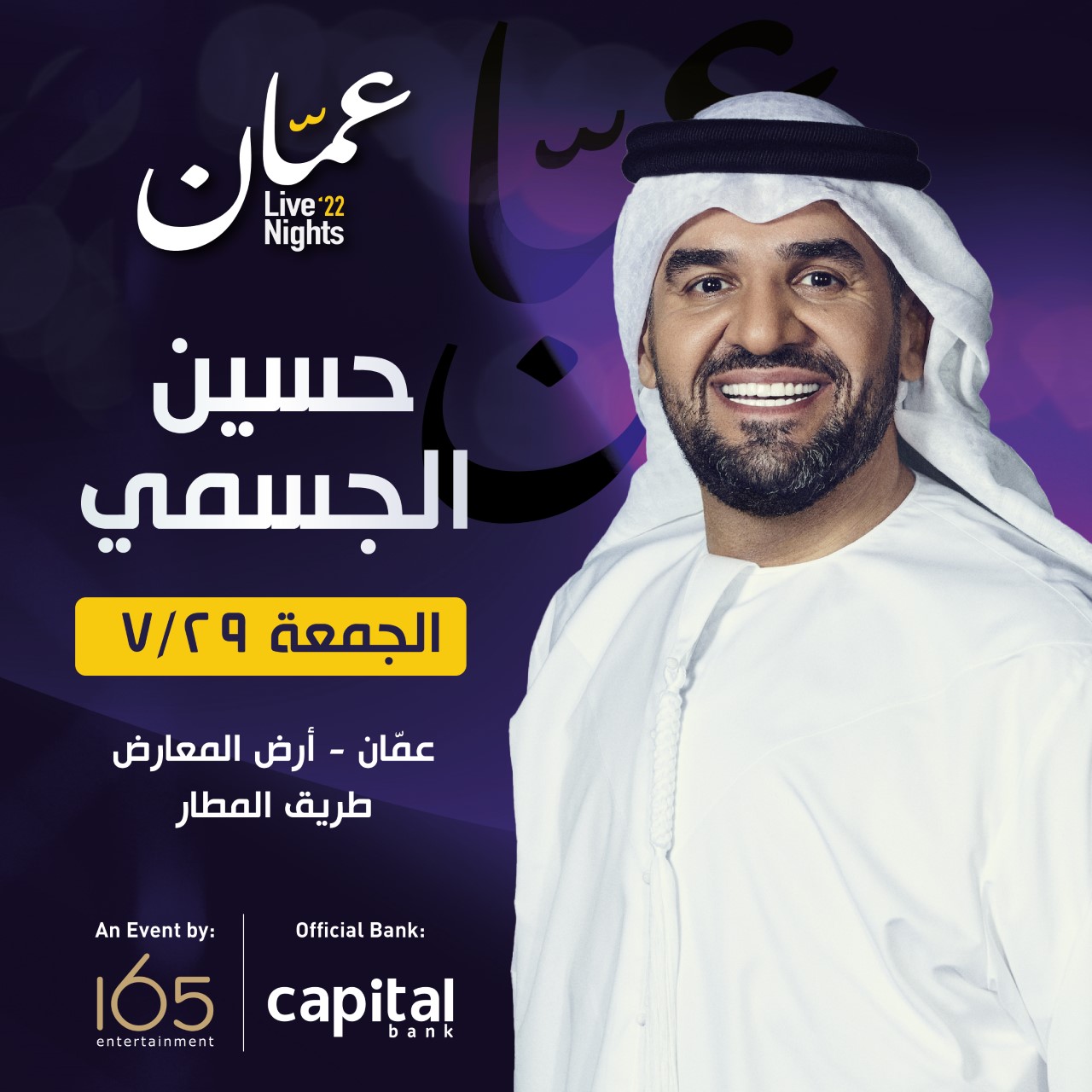 وبشوق كبير للأردن وجمهورها، وضمن الجولة العربية 2022، التي سيتقي بها مع أحبابه بكل حب في الدول العربية والعالمية، يستعد الجسمي لإحياء حفلاً غنائياً جماهرياً في مدينة عمّان عاصمة المملكة الأردنية الهاشمية يوم الجمعة الموافق 29 يوليو/تموز 2022، بفعاليات “عمّانLive Nights 22″، حيث قال عبر جميع وسائل التواصل الإجتماعي الرسمية: الأردن في القلب.. جولتنا العربية للقاء الجمهور مستمرة.. واليوم كلنا شوق ومحبة للقاء احبابنا النشامى الجمهور الأردني الغالي في مدينة #عمان مساء يوم 29 يوليو/تموز 2022 في أرض المعارض طريق المطار.. الفرحة تكتمل بكم وبحضوركم”، وأضاف قائلاً “والنشامى نلاقيها ونحيّيها”.