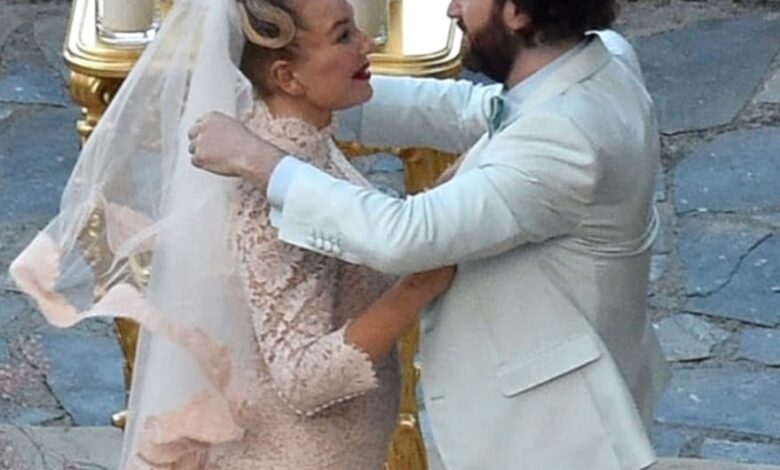 وتُظهرها الصور وهي تقول “أنا أفعل” بعد السير في الممر في فيلا أوليفيتا، وهو سكن فاخر يملكه المصممان دولتشي وجابانا، كان نفس المنزل الذي تبادلت فيه كورتني كارداشيان ونجم الروك ترافيس باركر وعودهما في حفل الزفاف في مايو الماضي.