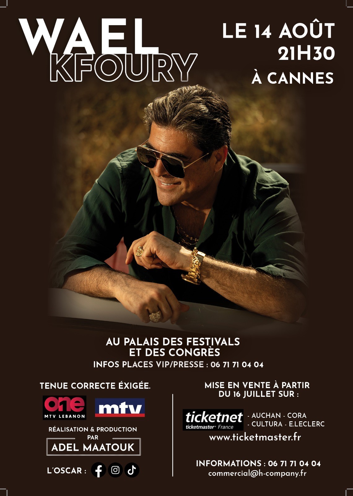 لأول مرة في تاريخها محافظة “كان” تنشر على مواقعها الرسمية اسم الفنان اللبناني وائل كفوري الذي سيقف على خشبة مسرح قصر المؤتمرات، palais Des Festivals العالمي الشهير الذي تقام فيه سنوياً حفلات توزيع جوائز مهرجانات “كان”، وهو الفنان العربي الأول الذي يقف على خشبة هذا المسرح العريق بدعم من السلطات الرسمية الفرنسية.