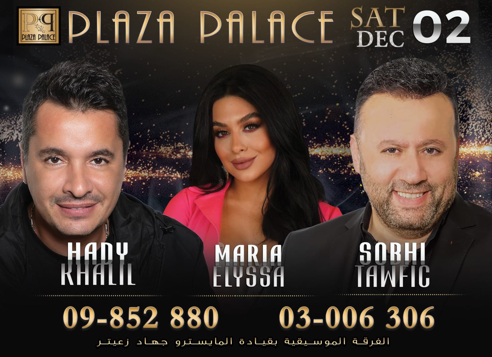 أعلنت إدارة الـ بلازا بالاس ” عن إحياء حفلة مميّزة ليل 2/12/2023 يحييها كلّ من النجم صبحي توفيق والنجم هادي خليل والنجمة ماريا إليسا على أنغام الفرقة الموسيقية بقيادة المايسترو جهاد زعيتر حيث من المتوقع أن تشهد الحفلة حشدًا كبيرًا من الساهرين الذين يتذوّقون حلاوة الفنّ الأصيل ويتمتّعون بحُسن الضيافة وروعة الإستقبال.