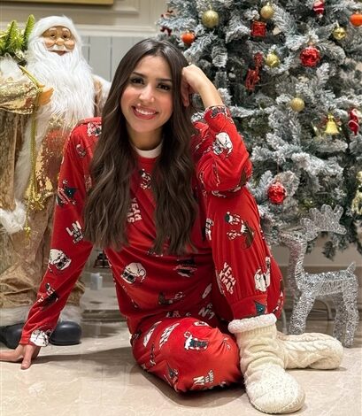 ظهرت جنات بصحبة ابنتيها وهن ترتدين بيجاما بنقوش الكريسماس باللون الأحمر، أمام الشجرة.