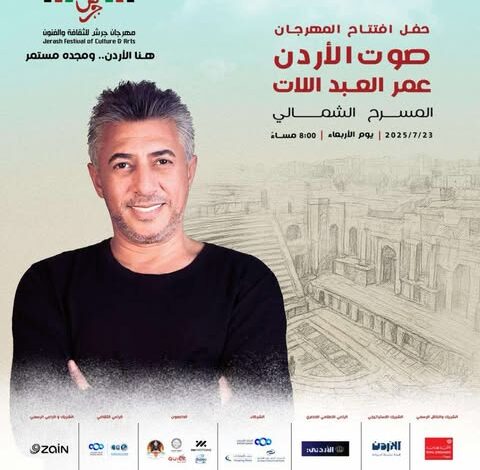 إختارت إدارة “مهرجان جرش للثقافة والفنون”، “صوت الأردن” الفنان عمر العبداللات، ليكون نجم حفل افتتاح دورة المهرجان التاسعة والثلاثين، وذلك يوم الأربعاء 23/7/2025، والذي يقام هذا العام من تحت شعار: “هنا الأردن .. ومجده مستمر”.