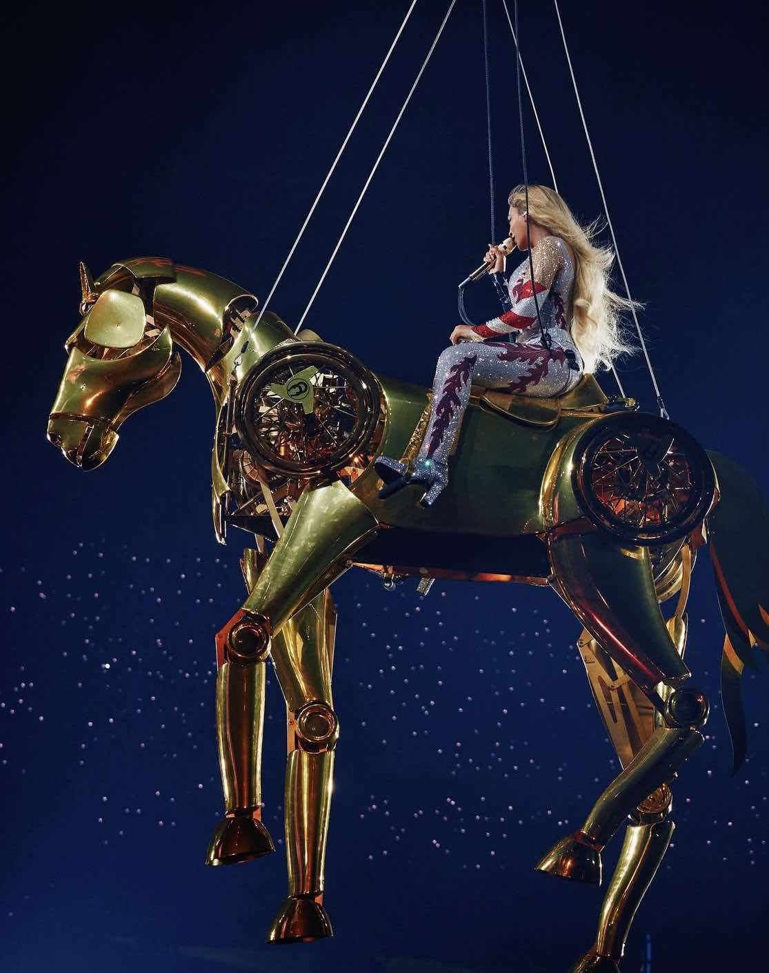خلال الحفل الحماسي، تساءل المعجبون ما إذا كانت بيونسيه ستعود لأغنيتها الشهيرة “16 عربة”، إلى جانب حيلة السيارة الطائرة اللافتة. في نهاية الحفل، قامت بيونسيه بأداء الأغنية بالفعل. ولكن هذه المرة، حلقت في الهواء على حصان آلي.