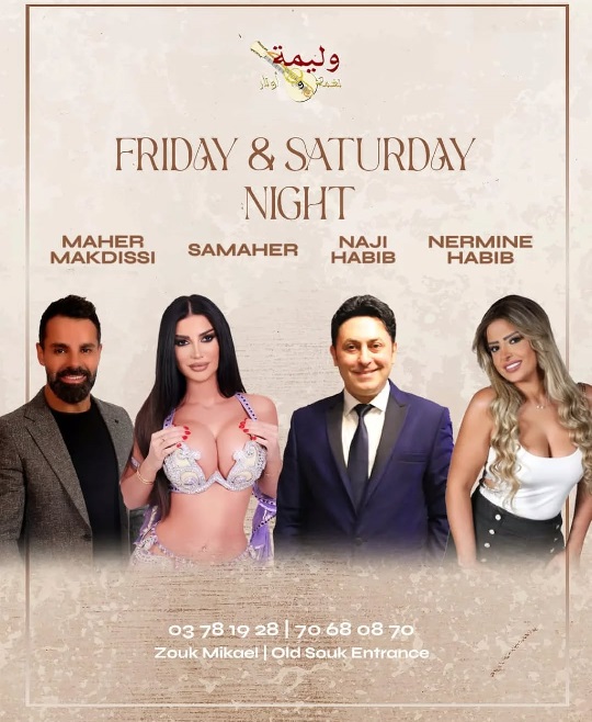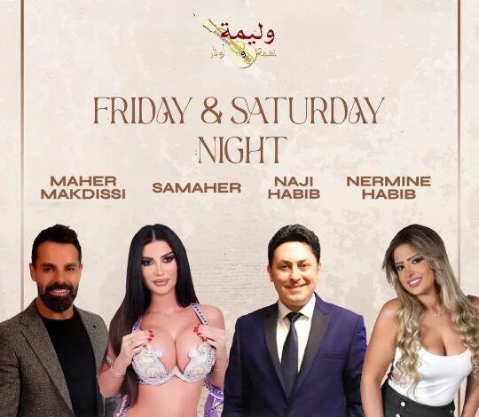 ما زالت البرامج الفنية الراقية تحجز مكانها ليلتي الجمعة والسبت في مطعم “وليمة”- زوق مكايل، لصاحبه الأستاذ قزحيا عقيقي، حيث يتوافد عدد كبير من الساهرين لتمضية ليلة من العمر في صالته الجميلة، على أنغام الفرقة الموسيقية وأغنيات نخبة من النجوم، في طليعتهم: ناجي الحبيب، نيرمين حبيب، وماهر مقدسي، إلى جانب لوحات راقصة مميزة تقدّمها الراقصة الشرقية سماهر.