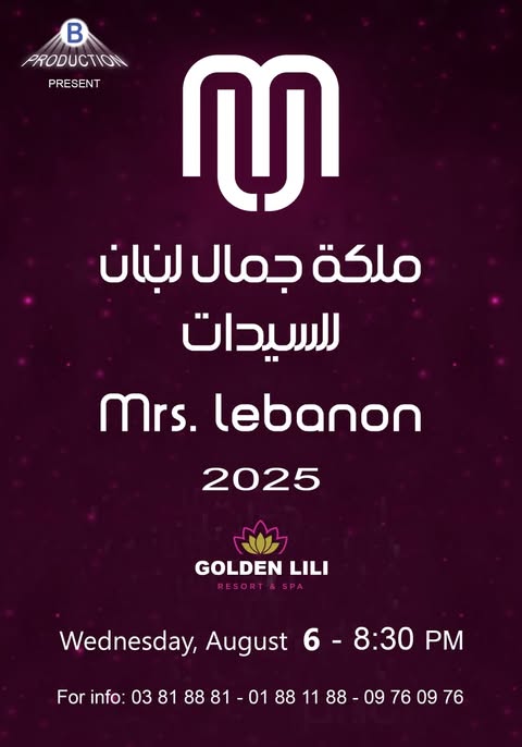 ليلة الأربعاء في 6 آب 2025، يترقّب عشّاق الجمال والسهرات الراقية الحدث الأبرز، حيث يُقام حفل إنتخاب ملكة جمال لبنان للسيدات 2025 في مجمّع Golden Lili Resort – عاليه، تحت إشراف الأستاذ زخيا بربور، الوكيل الحصري لهذا الحدث على مستوى لبنان، ومن تنظيم B Production.