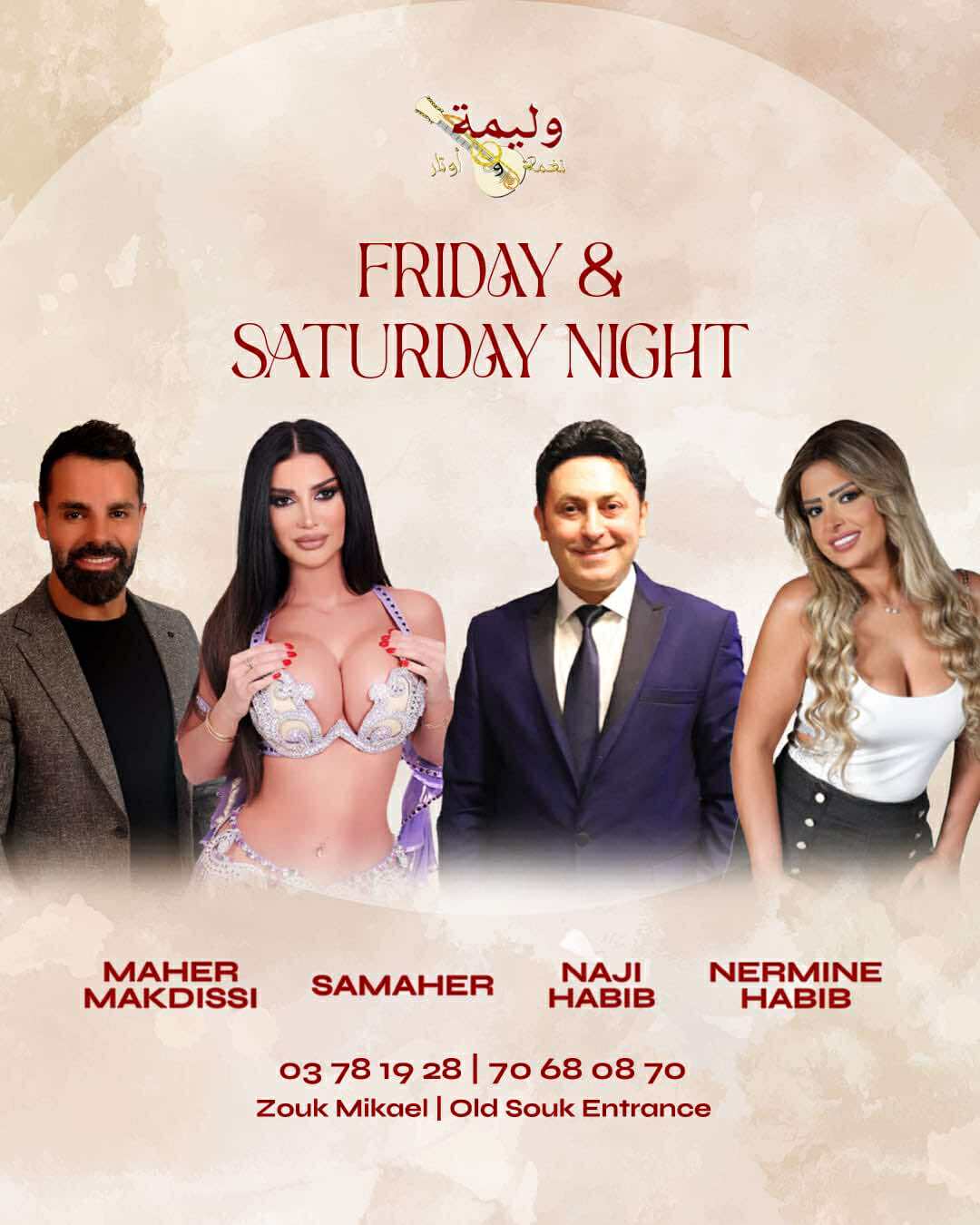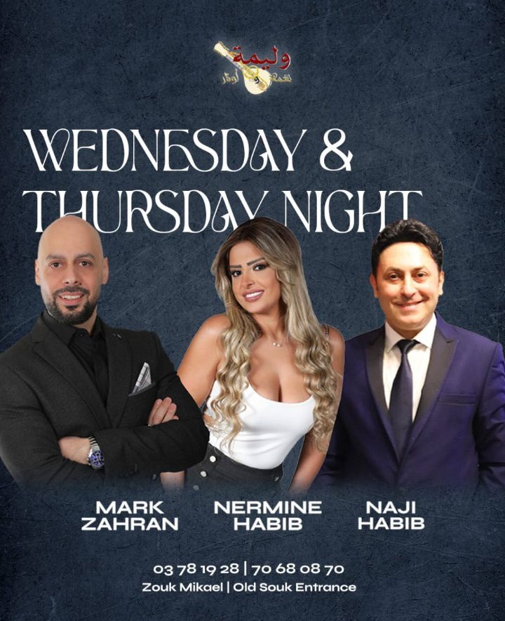 كذلك ليلتي الجمعة والسبت، حيث يقدّم ” وليمة – أوتار ” سهرتين مميّزتين أيضًا يحييهما النجم ” ناجي الحبيب ” والمطربة ” نيرمين حبيب ” والمطرب ” ماهر مقدسي” إضافة الى لوحات فنية راقصة تقدّمها الراقصة الشرقية “سماهر” .