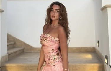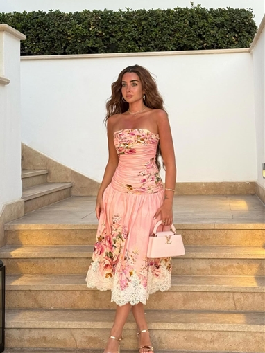 ونسقت هنا الفستان مع حقيبة من دار Louis Vuitton باللون الوردي، من طراز Capucines MM مصنوعة ببراعة من جلد توريلون كامل الحبيبات بلون محايد رقيق، وهي مزينة بأزهار المينا المرسومة يدويًا والمثبتة بشعار LV، وتزين أزهار إضافية حوامل المقبض الذهبية، تضفي البطانة الجلدية المطبوعة بالزهور لمسة ربيعية أنيقة على هذه القطعة الأنيقة.