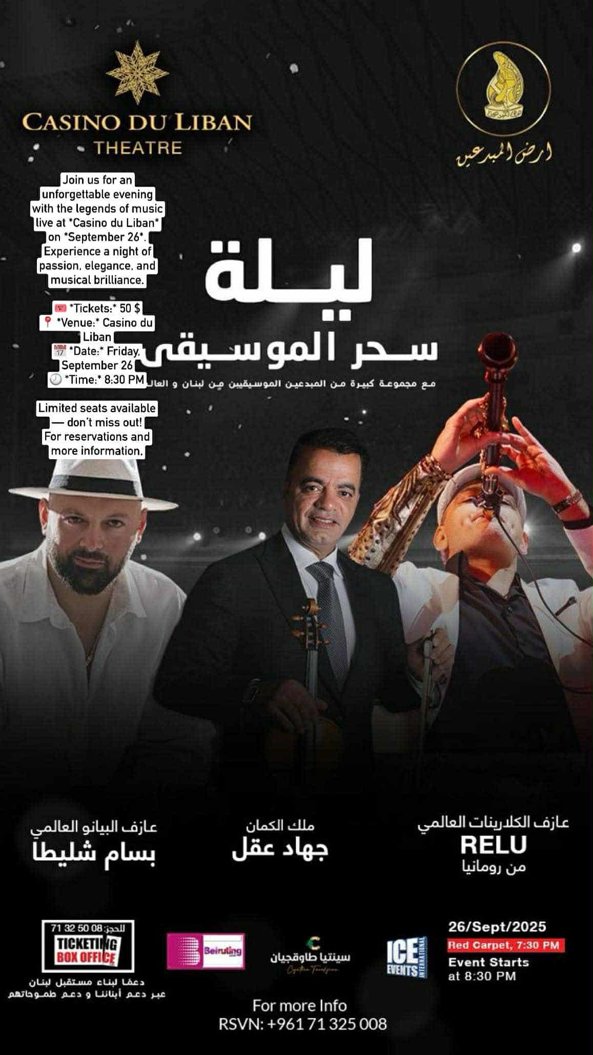 إنها بحق ليلة موسيقية بإمتياز، حيث يلتقي الشرق والغرب في مزيج ساحر من الأنغام الراقية التي تجعل من السهر في كازينو لبنان موعدًا لا يُفوّت.