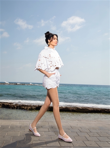 كما اختارت سيرين إطلالة باللون الأبيض، من قطعتين الأولى قميص أبيض قصير وواسع كشف عن بطنها، مع شورت أبيض قصير. ولملمت شعرها ورفعته للأعلى.