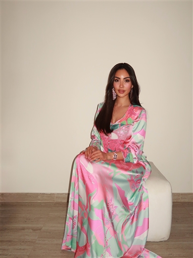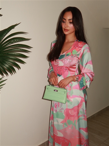 وكان طويلا بأكمام طويلة وألوان زاهية، يدمج الألوان الوردي والأخضر، برسومات على شكل غزالة، ومطرز من منطقة الصدر.